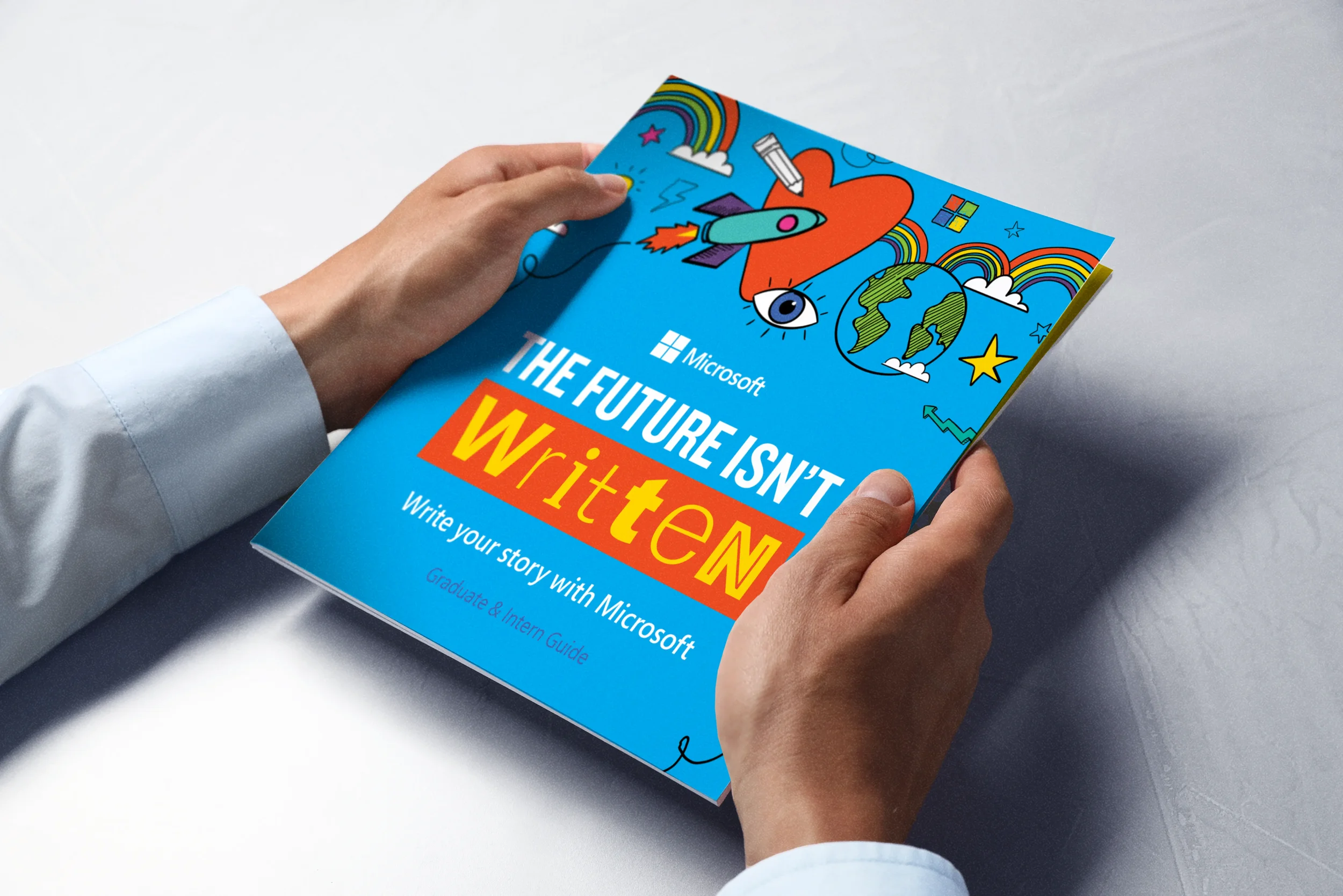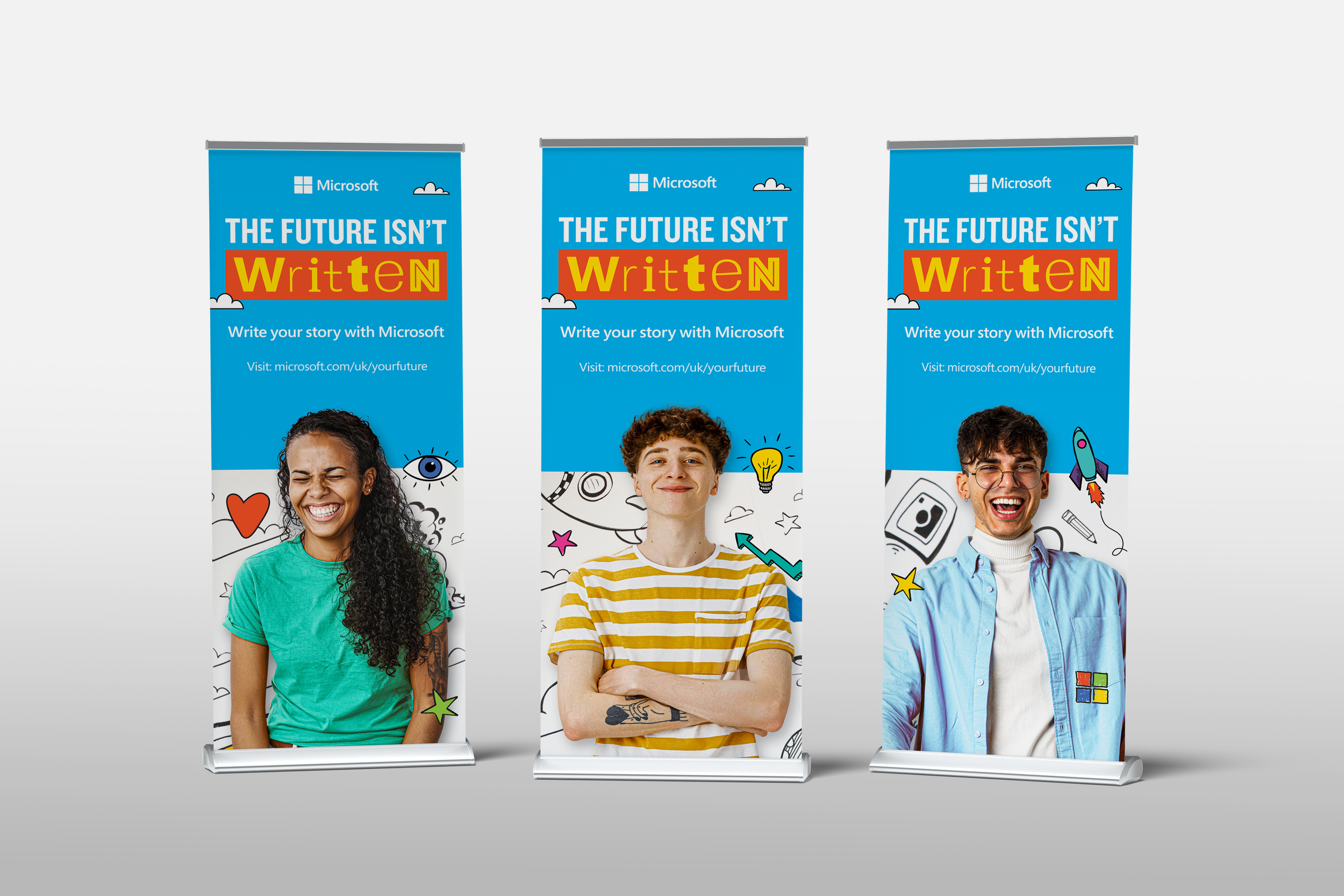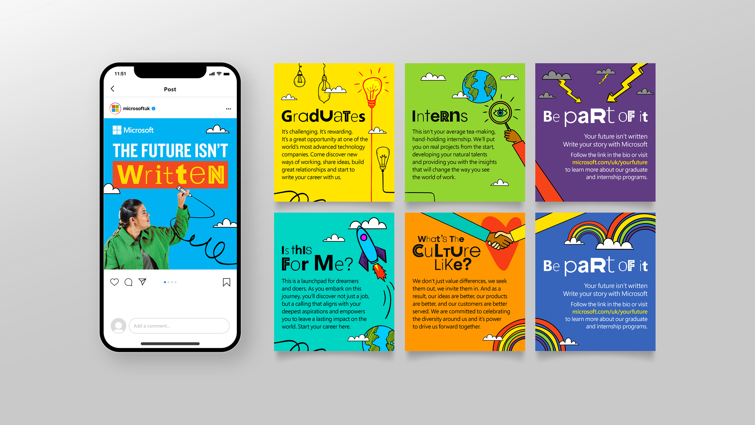 Playful line illustrations were also layered throughout the campaign collateral. These illustrations symbolised imagination, their dreams and untapped potential, a metaphor that each individual’s path is still being written. This campaign successfully positioned Microsoft across digital, social and campus recruitment channels, highlighting its commitment to empowering young talent to shape the future rather than simply follow it. These examples illustrate how the campaign was adapted seamlessly from large-format print to online digital assets.